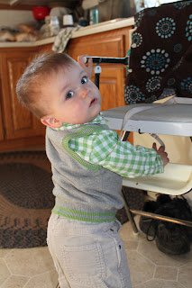 He has also started to walk or at least have an interest in walking. A few weeks ago at our friends house he took his first 2 steps. He only did this on slim occassions, but still preferred crawling his main form of transportation. The last few days he has really shown an interest in walking. He will stand up in the middle of a room and walk the rest of the way to his desired location.
